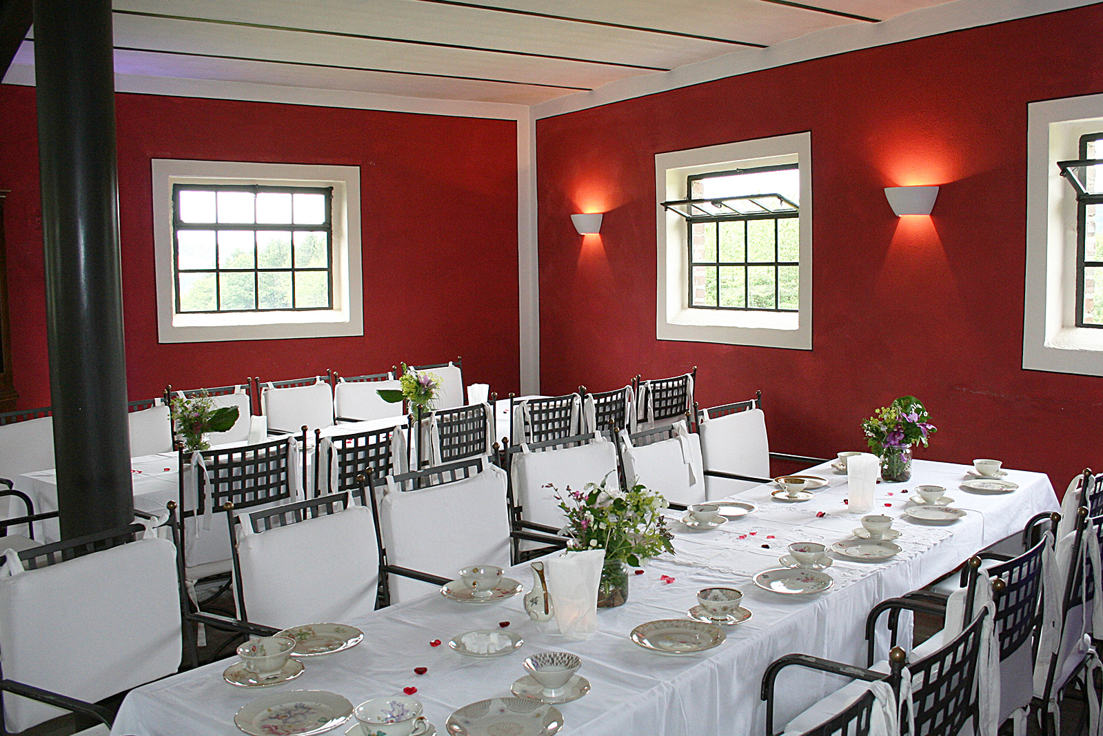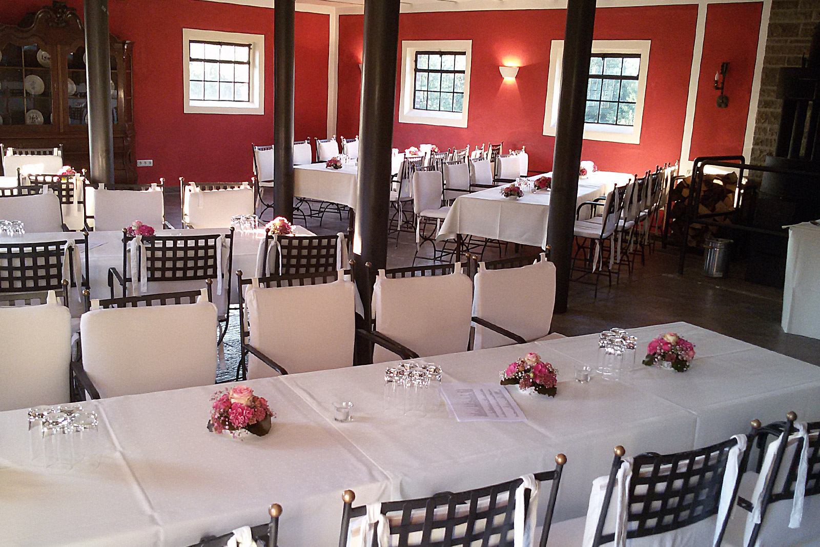 Im ehemaligen Stall ist eine Bankettbestuhlung für bis zu 80 Personen möglich. Für deutlich mehr Gäste kann in der urigen Scheune eingedeckt werden.