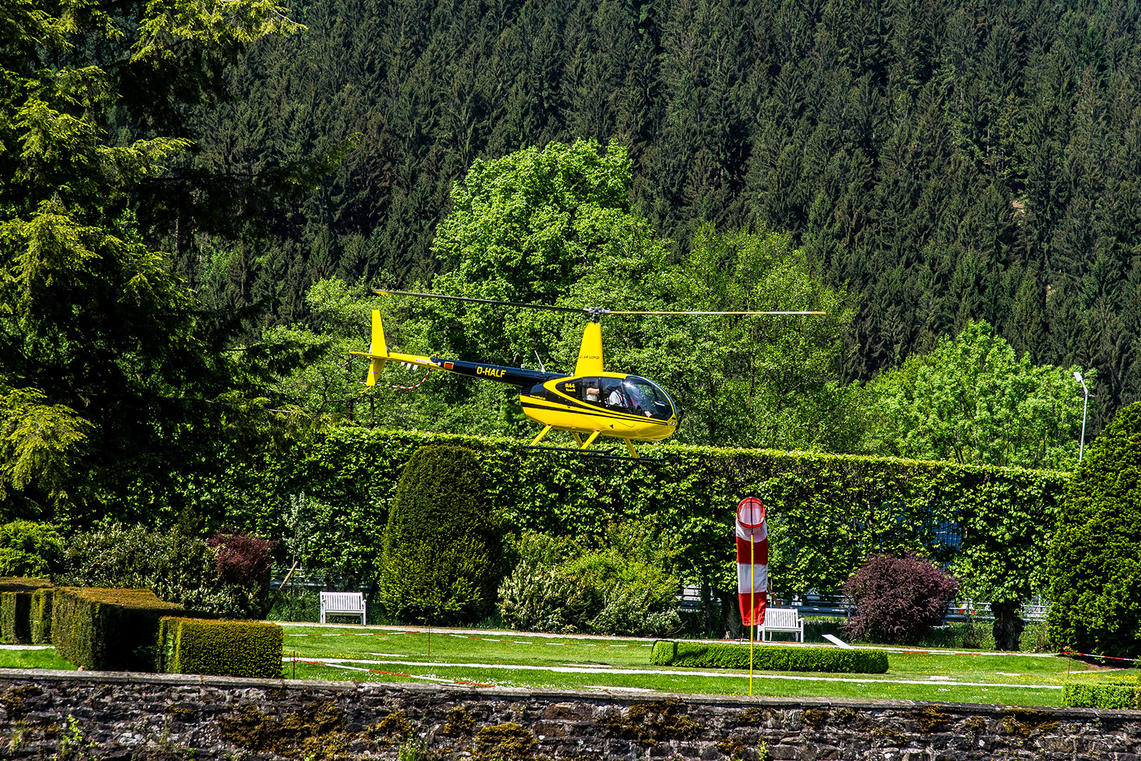 Der Hubschrauber landet im Schlosspark oder auf den Wiesen rund um Schloss Ehreshoven. Die Hochzeitsgäste warten unten und können das Geschehen über Funk mitverfolgen. Ein Rundflug über das schöne Bergische Land bis hin nach Köln ist möglich.