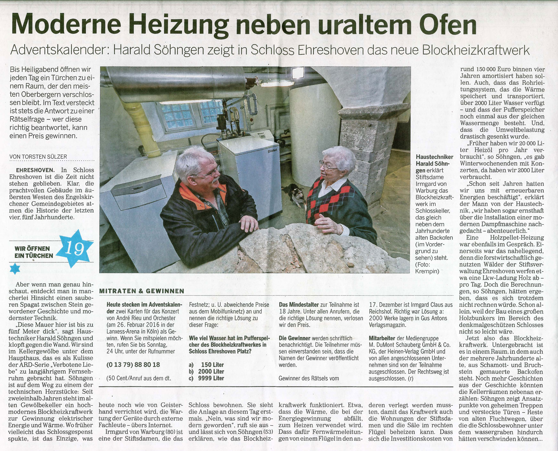 Die Oberbergische Volkszeitung berichtete in ihrer Serie "Adventskalender" über verschlossene Räume im Oberbergischen und am 19.12.2015 über das neue Blockheizkraftwerk im Stift Ehreshoven. Lesen Sie hier den ganzen Artikel